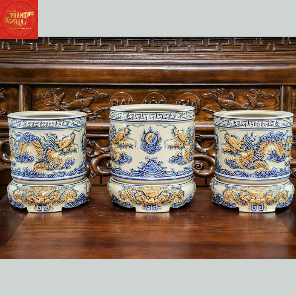 Bát Hương Đắp Nổi Song Long Chầu Nguyệt Men Hoàng Thổ