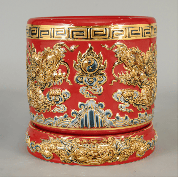 Bát Hương Song Long Chầu Nguyệt Màu Đỏ Đắp Nổi Vẽ Vàng