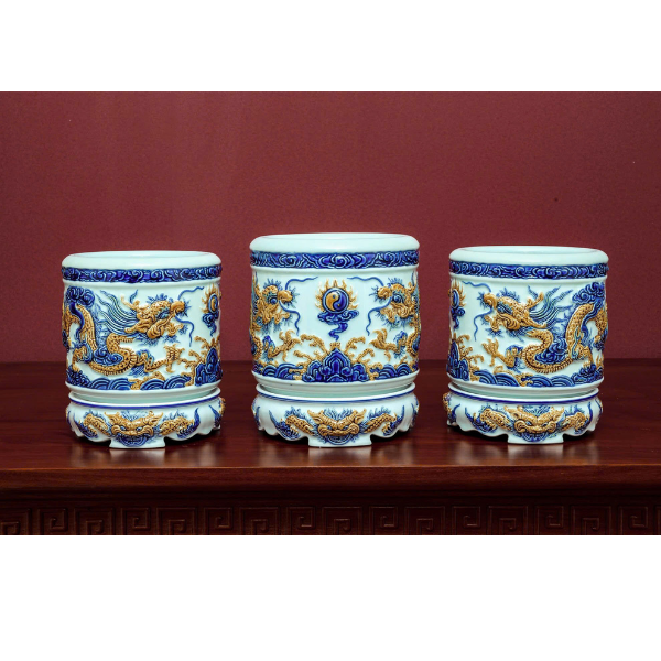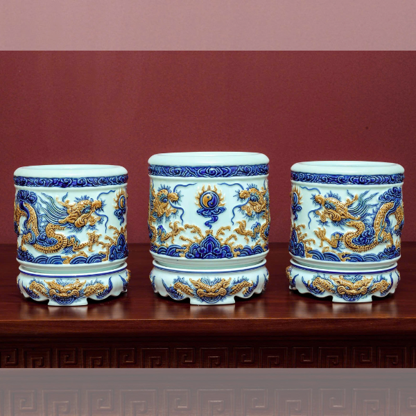Bát Hương Song Long Chầu Nguyệt Men Ngọc Đắp Nổi