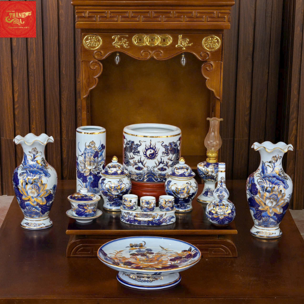Bộ Đồ Thờ Ban Tài Địa Men Lam Vẽ Vàng