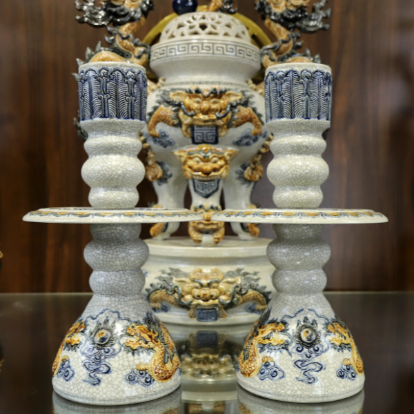 Cây Nến Song Long Chầu Nguyệt Men Rạn Đắp Nổi