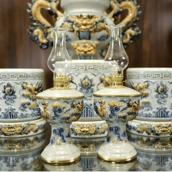 Đèn Dầu Long Phượng Chầu Ngọc Men Rạn Đắp Nổi