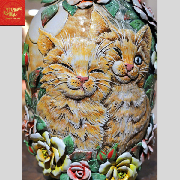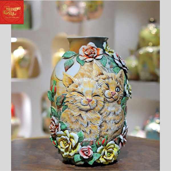 Lọ Hoa Đắp Nổi Vẽ Vàng Họa tiết Mèo Con