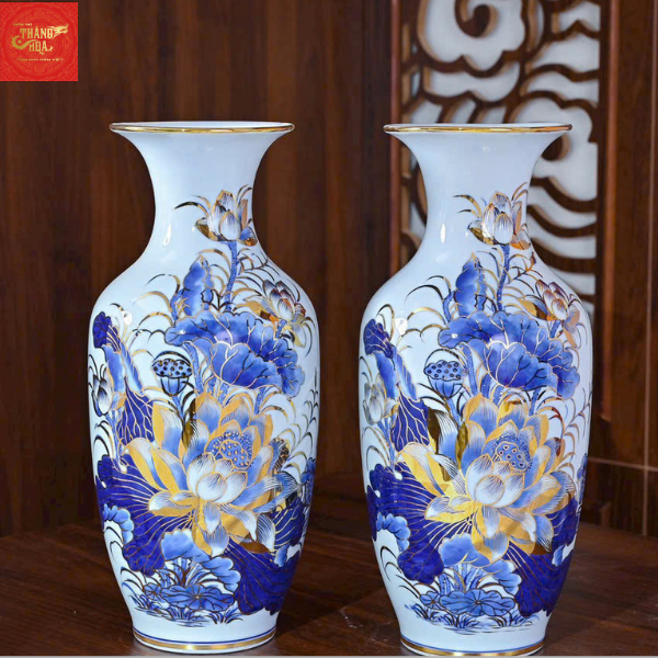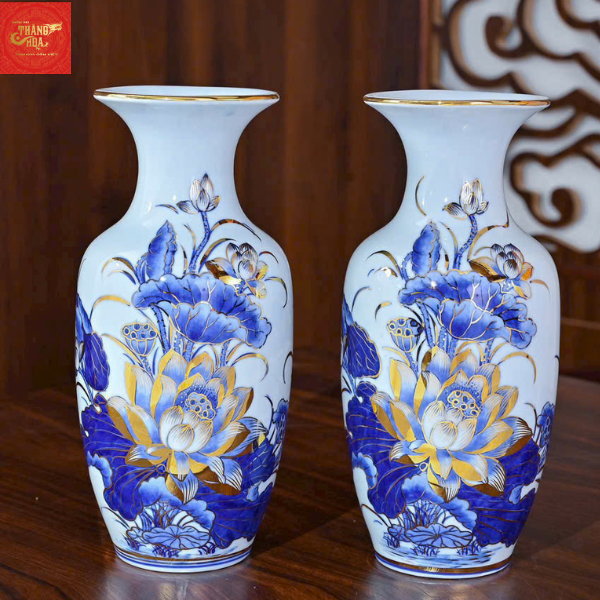 Lọ Lộc Bình Hoa Sen Men Lam Vẽ Vàng