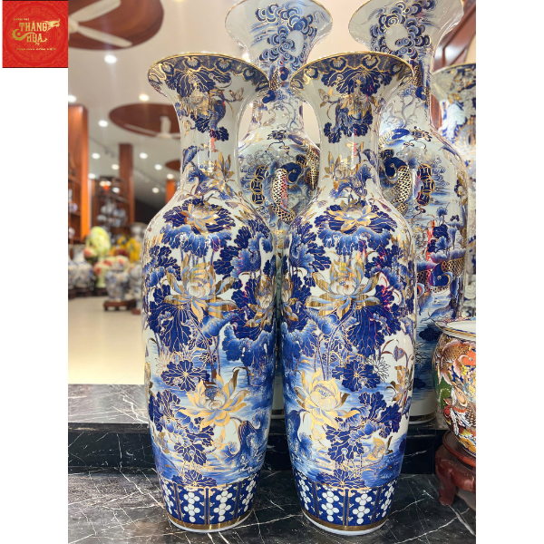 Lọ Lộc Bình Sen Phú Qúy Men Lam Vẽ Vàng