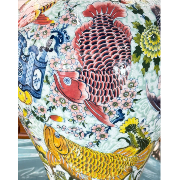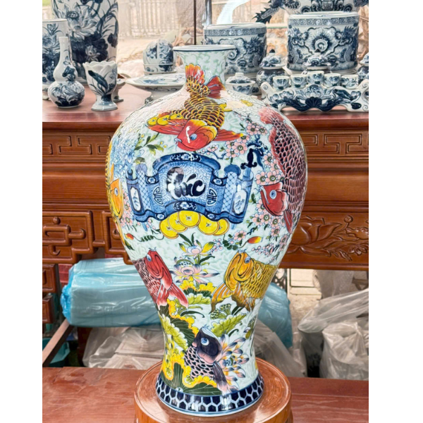 Mai Bình Cá Chép Cuốn Thư Nền Gấm H70