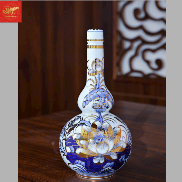 Nậm Rượu 2 bầu vẽ sen men lam vẽ vàng