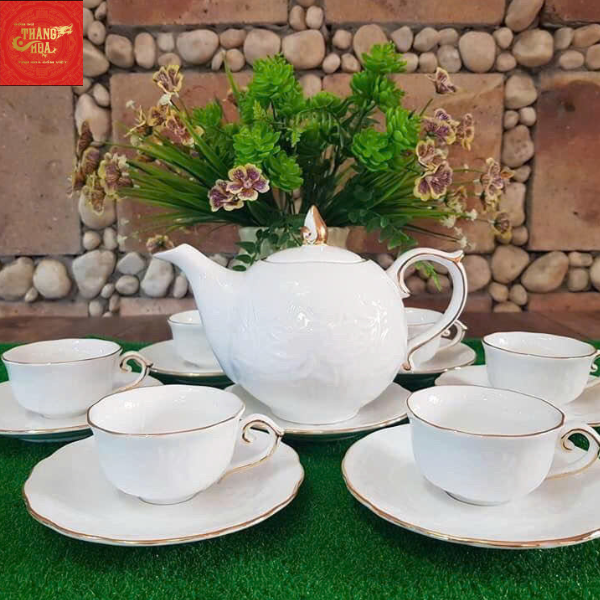 Ấm Chén Mẫu Đơn -Hoa sen khắc nổi vẽ vàng