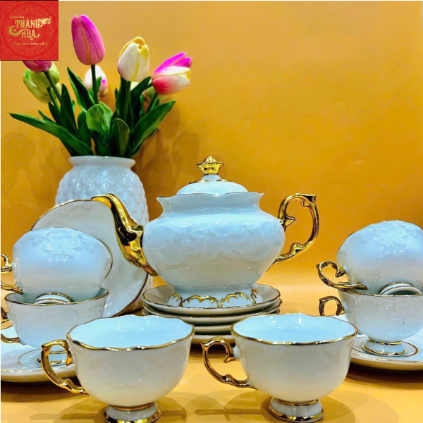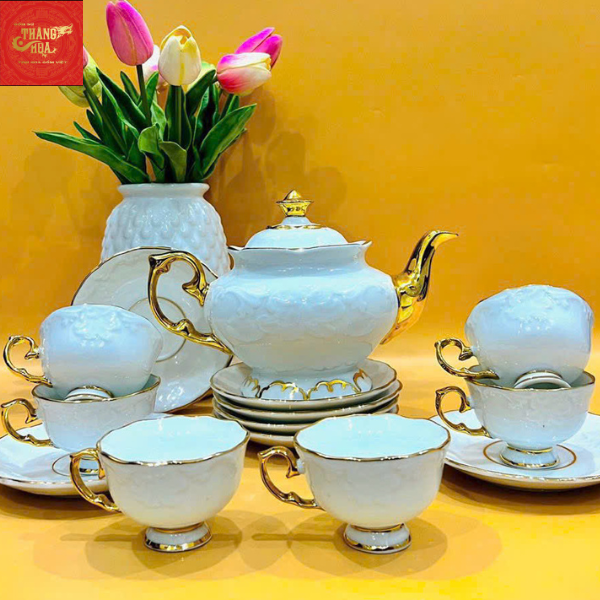 Ấm Chén Dáng Ly -Họa Tiết Nổi-Kẻ Chỉ Vàng 850ml