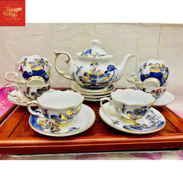 Ấm Chén Thần đèn -Hoa sen vẽ vàng
