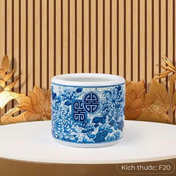 Bát Hương Cúc Vạn Thọ -Nền Gấm Men Lam