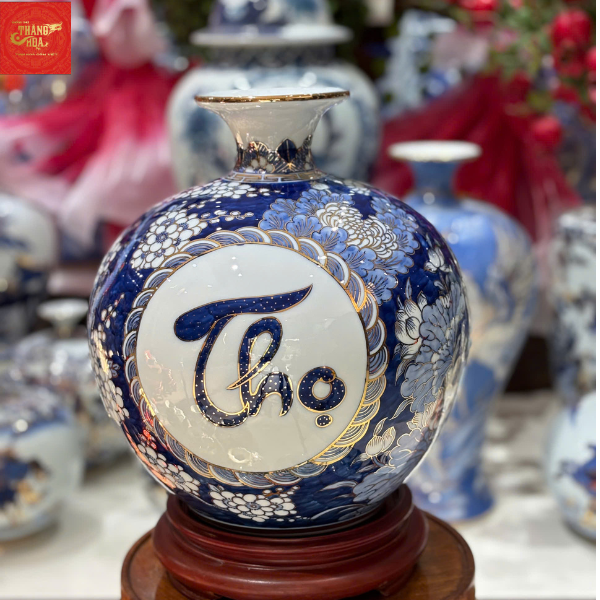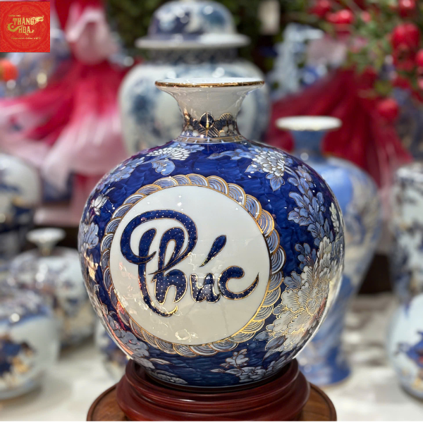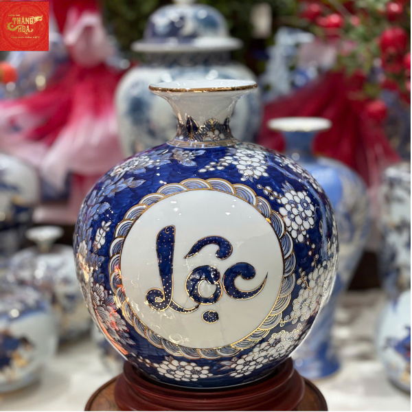 Bình Hút Lộc Phúc Lộc Thọ Men Lam Vẽ Vàng H30
