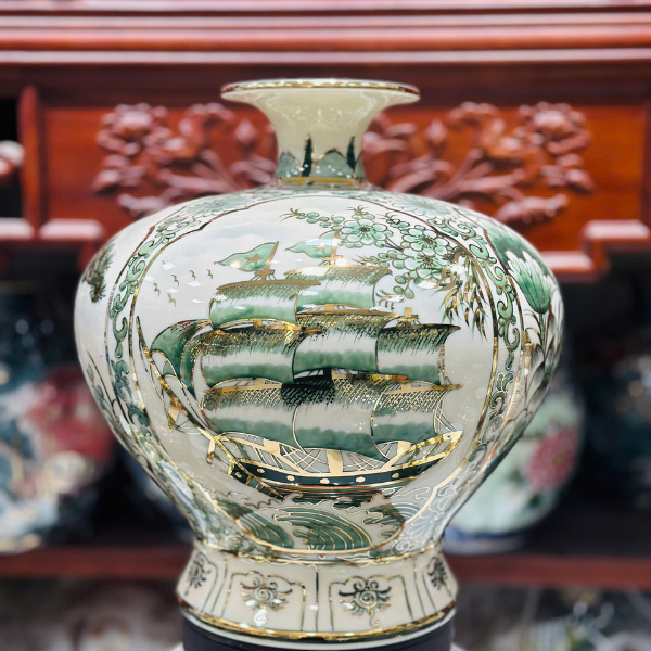 Bình Hút Lộc Vẽ Nhị Cảnh Thuận Buồm Xuôi gió-Công Danh Phú Qúy Men Hoàng Thổ H35