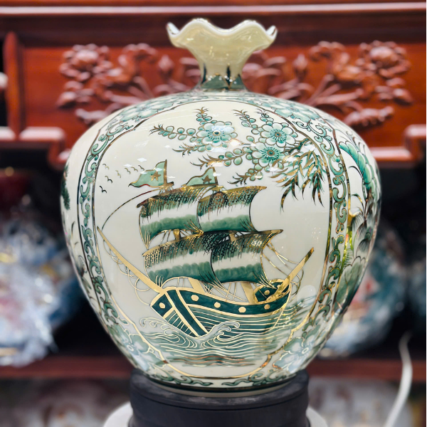 Bình Hút Lộc Vẽ Nhị Cảnh Thuận Buồm Xuôi gió-Công Danh Phú Qúy Men Hoàng Thổ H35