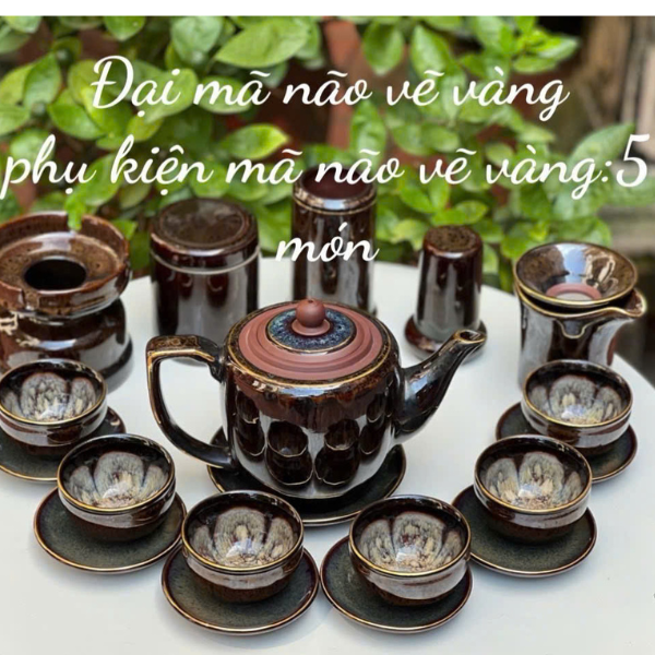 Bộ Ấm Chén Trà Gốm Tử Sa -Mã Não Vẽ Vàng Kèm Phụ Kiện
