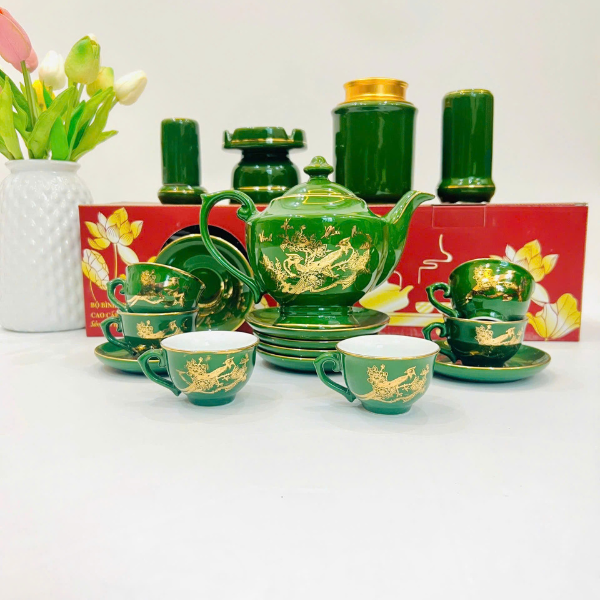Bộ ấm Chén Uống Trà Màu Xanh Lục Bảo Vẽ Vàng Kim