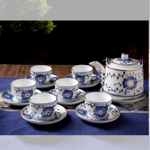 Bộ ấm Chén Men Lam Hoa Dây Vẽ Vàng