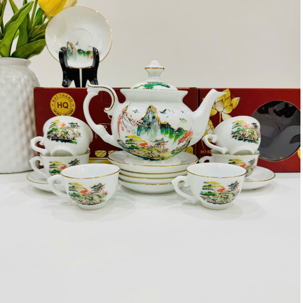 Bộ ấm Chén Uống Trà Phú Qúy Cảnh Sơn Thủy Vẽ Vàng