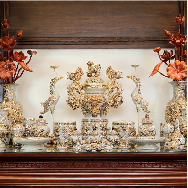 Bộ Đồ Thờ Men Rạn Đắp Nổi Vẽ Vàng