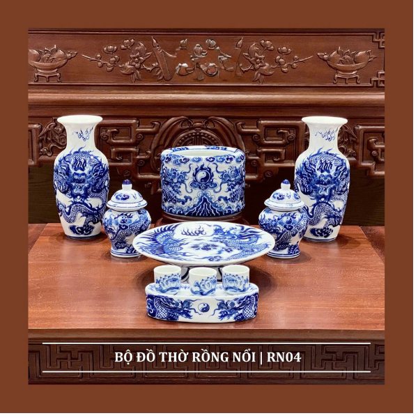 Bộ Đồ Thờ Song Long Chầu Nguyệt Nổi Men Lam