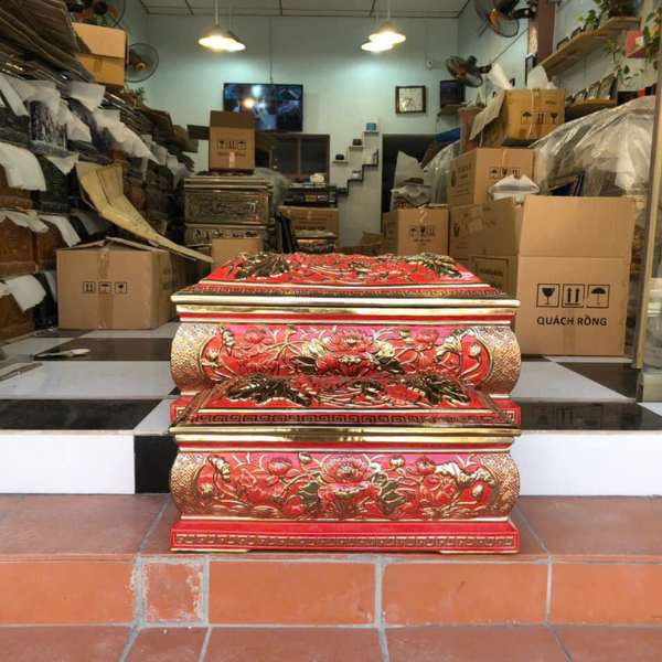 Bộ Quách Tiểu Sứ Hoa Sen Nổi Màu Đỏ Vẽ Vàng