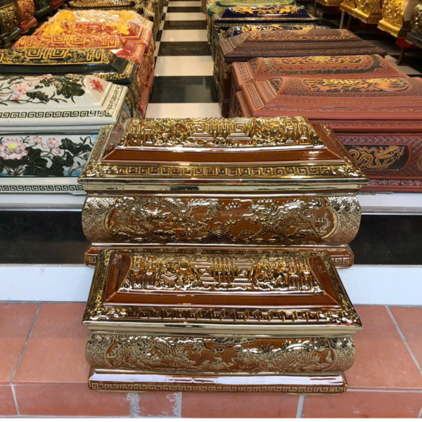 Bộ Quách Tiểu Sứ Rồng Nổi Màu Nâu Vẽ Vàng