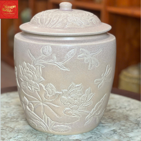 Hũ Gạo Khắc Nổi Hoa Văn Màu Trắng Ngà