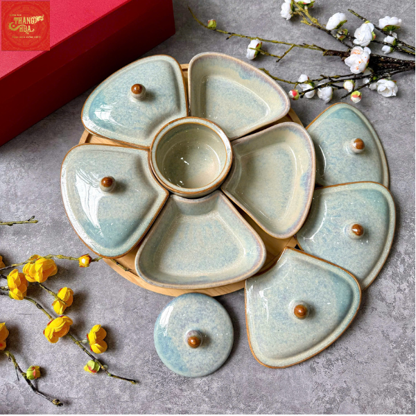 Khay mứt tết 5 cánh men hỏa biến trắng