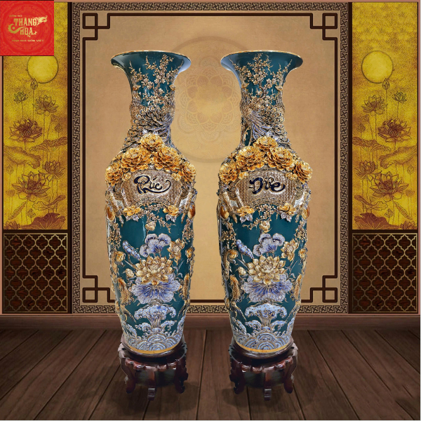 Lọ Lộc Bình Phúc Đức Đắp Nổi Màu Xanh Lục Bảo Vẽ Vàng