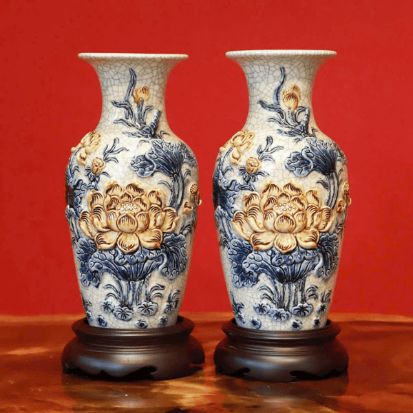 Lọ Lộc Bình Hoa Sen Men Rạn Đắp Nổi Vẽ Vàng