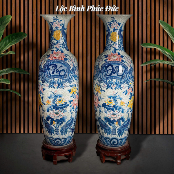 Lọ Lộc Bình Phúc Đức Nền Gấm Men Lam