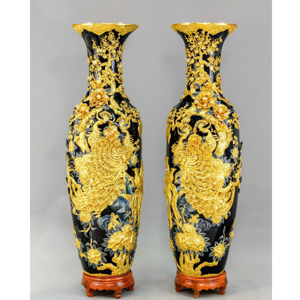 Lộc Bình Phú Qúy Trường Xuân Màu Xanh Coban Đắp Nổi Dát Vàng