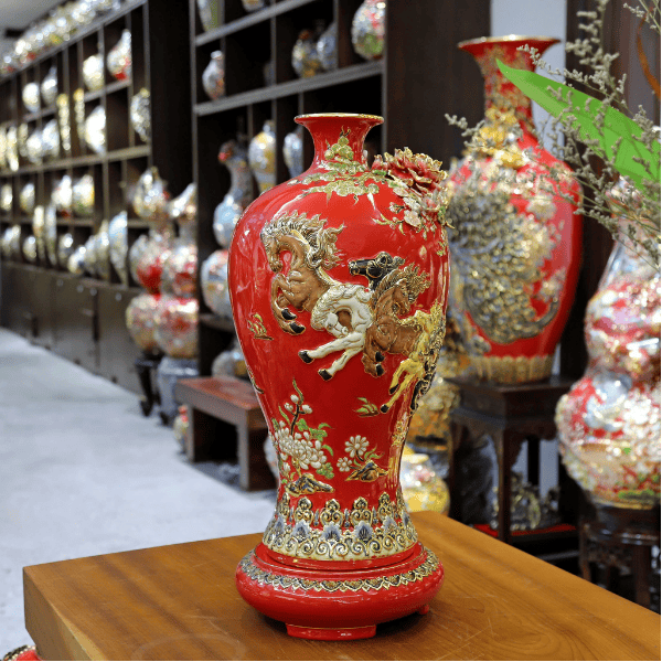 Mai Bình Mã Đáo Thành Công Màu Đỏ Đắp Nổi Vẽ Vàng
