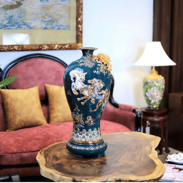 Mai Bình Mã Đáo Thành Công Màu Xanh Lục Bảo Đắp Nổi Vẽ Vàng