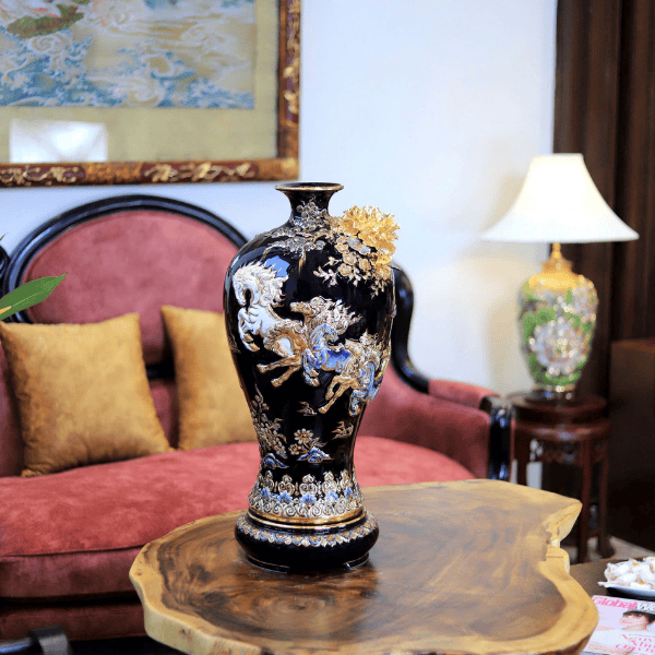 Mai Bình Mã Đáo Thành Công Màu Xanh Coban Đắp Nổi Vẽ Vàng