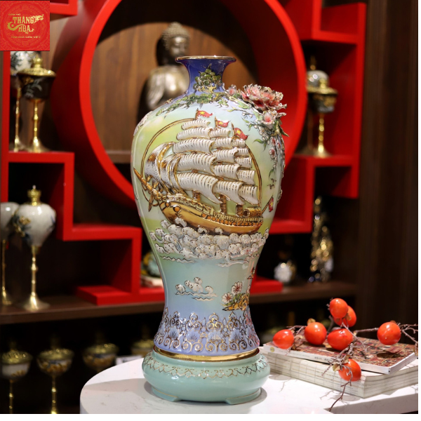 Mai Bình Thuận Buồm Xuôi gió Đắp Nổi Vẽ Vàng Men Loang